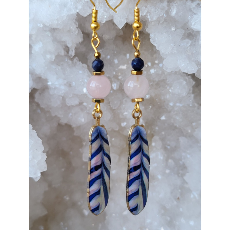 Boucles d'oreilles Plumes en acier inoxydable qui se compose de pierres naturelles Quartz rose et sodalite facettés.