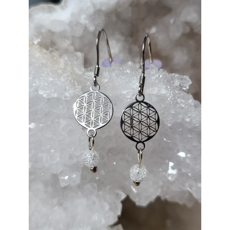 Boucles d'oreilles fleur de vie argent 0,925 et cristal de roche craquelé