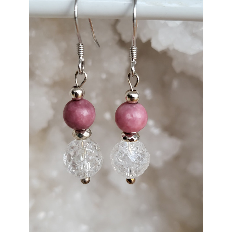 Boucles d'oreilles argent, Rhodonite et Cristal de roche Craquelé