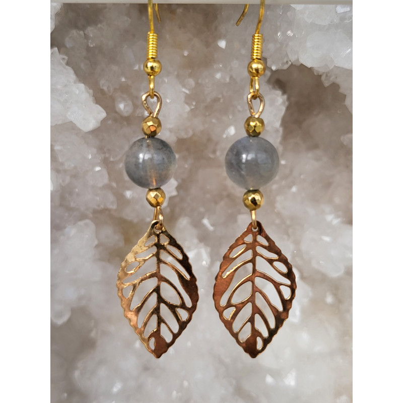 Boucles d'oreilles acier inoxydable doré, Feuilles et Labradorite