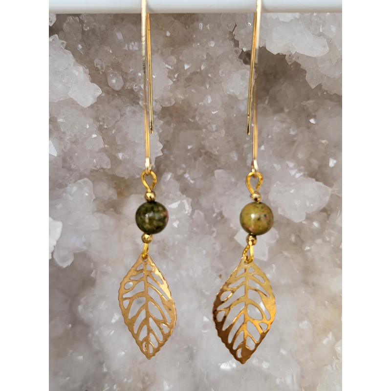 Boucles d'oreilles acier inoxydable doré, Feuilles et Unakite