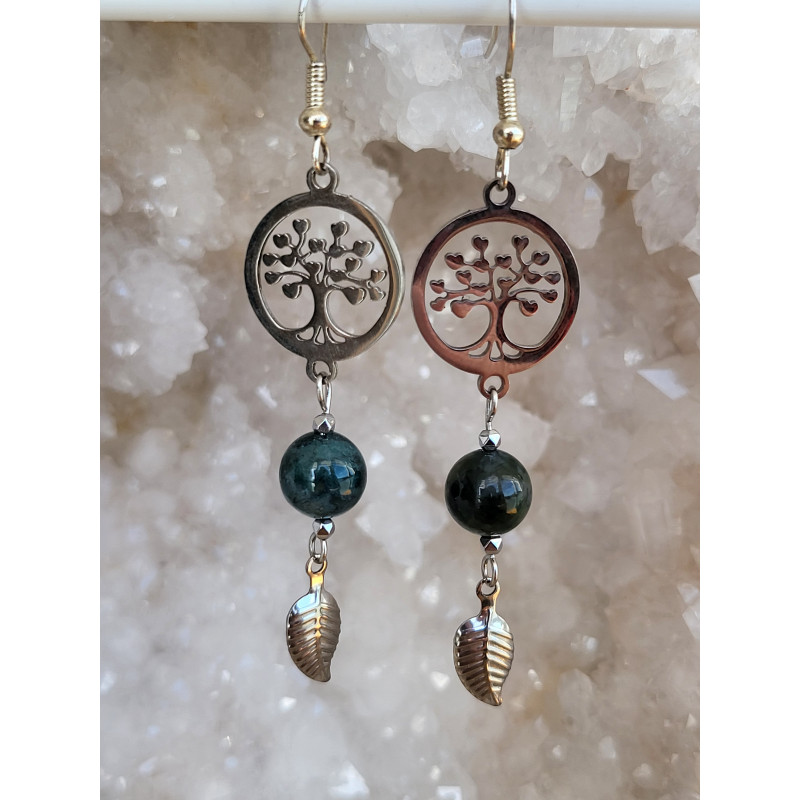 Boucles d'oreilles en acier inoxydable, Arbre de vie et Agate mousse