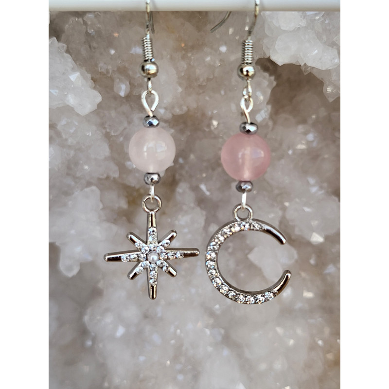 Boucles d'oreilles en acier inoxydable, dépareillées Lune et Soleil avec Quartz rose