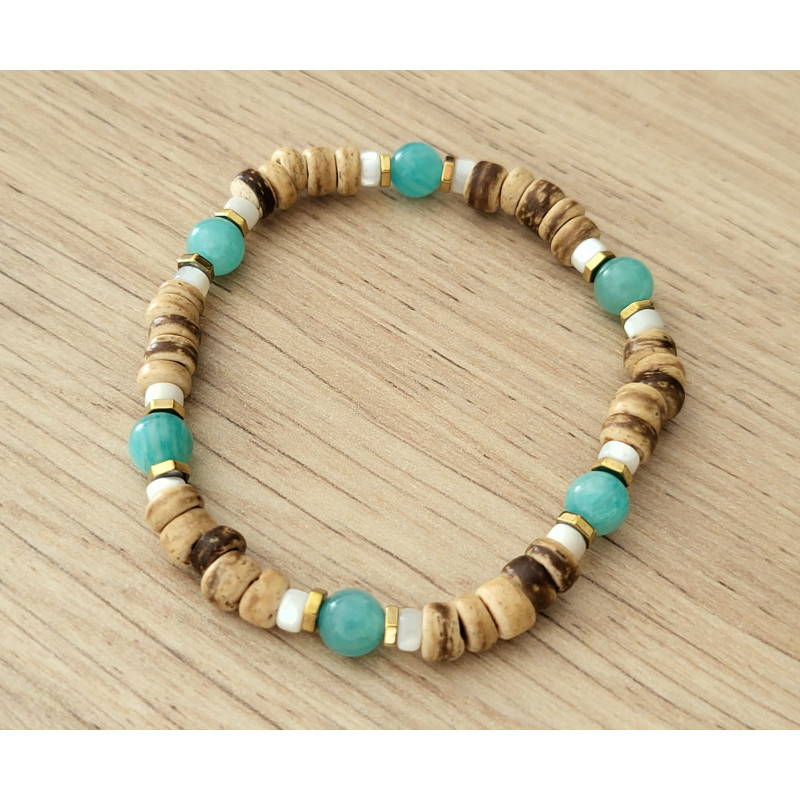 Bracelet bois de coco et pierres naturelles d'Amazonite et petite perles de Nacre