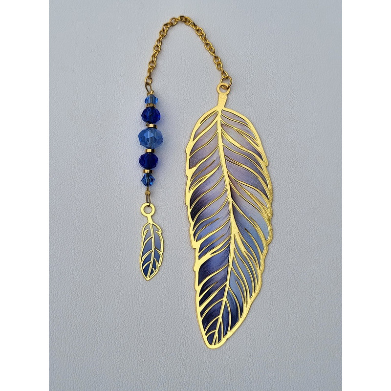 Marque page doré Plume bleu composé de perles en cristal de verre bleu