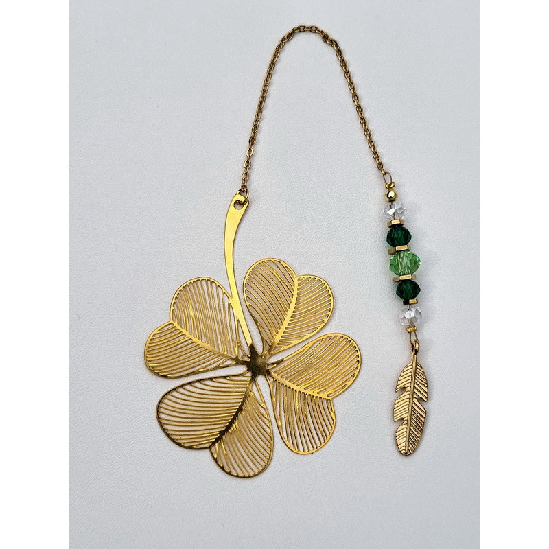 Marque page doré trèfle à quatre feuilles composé de perles en cristal de verre
