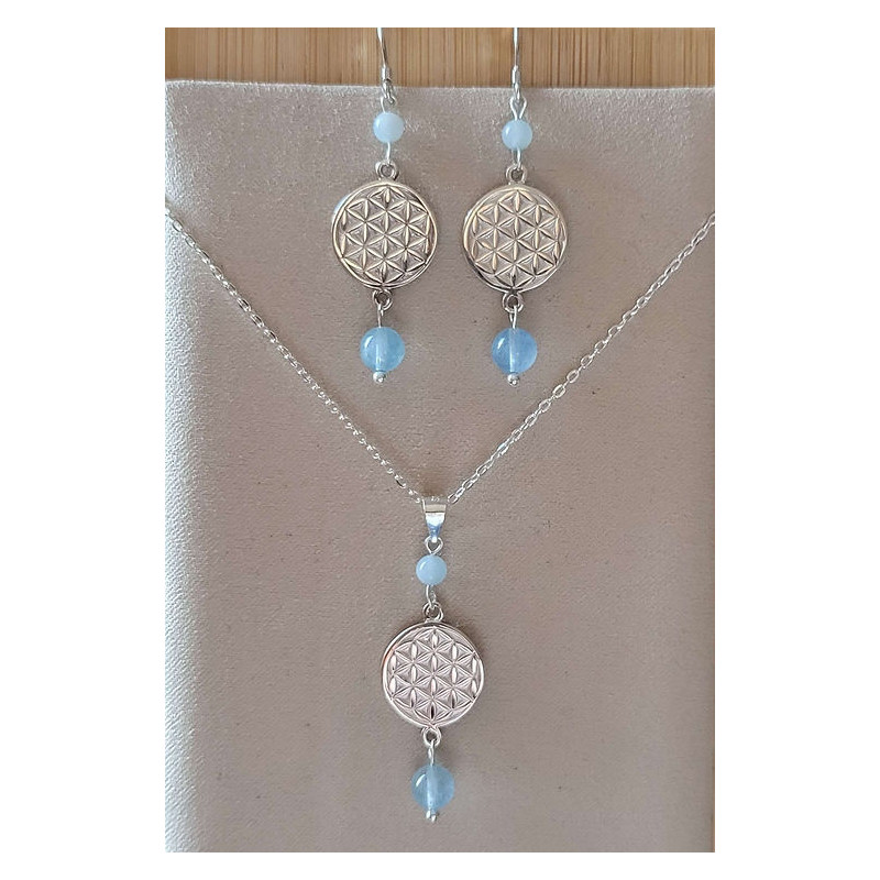 Parure "Fleur de vie" composée d'un collier et de boucles d'oreilles en argent 0,925. Pierres naturelles et non teintées en Aigue-Marine. Longueur de la chaîne 41 cm, possibilité d'y rajouter une chainette de rallonge de 5 cm.