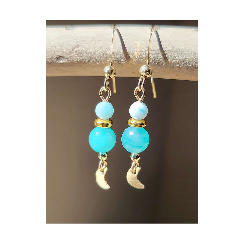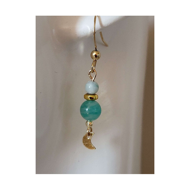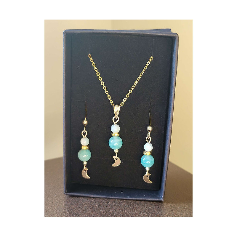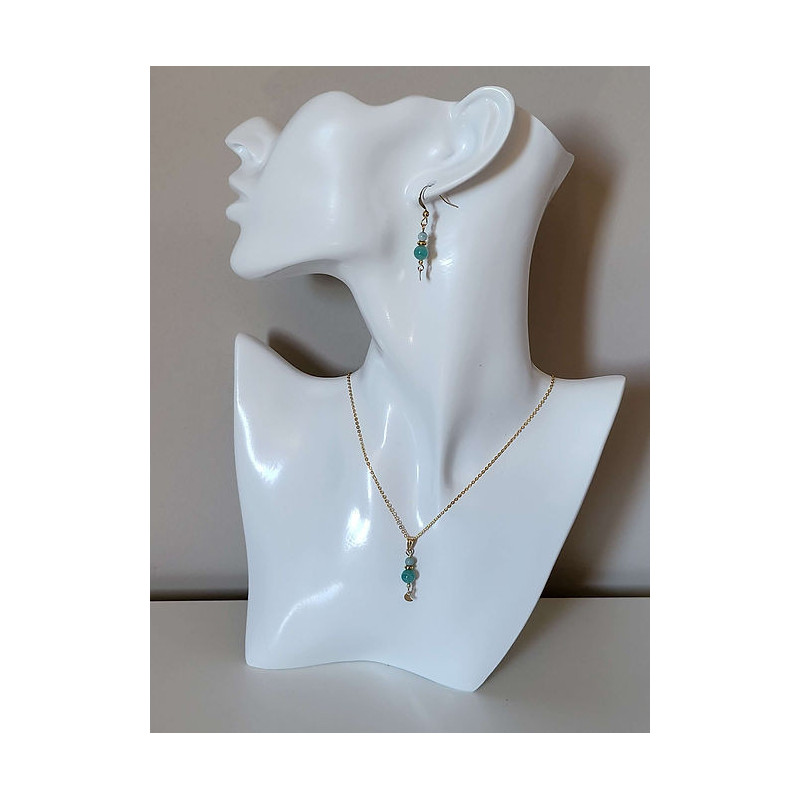 Parure composée d'un collier et de boucles d'oreilles en Amazonite montées sur Gold-filled (Entre l'or et le plaqué or). Zéro allergies : sans nickel, sans plomb et sans cadmium. Longueur chaîne 41 cm