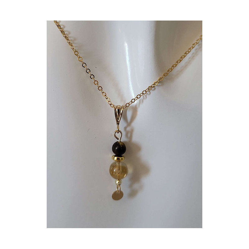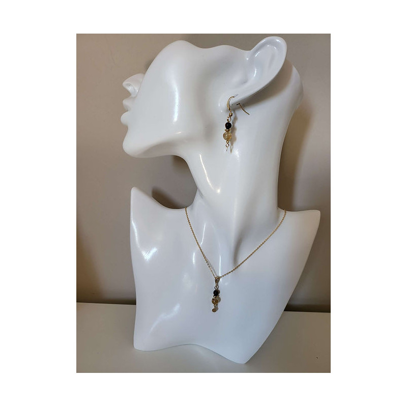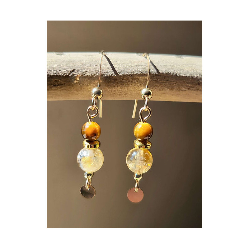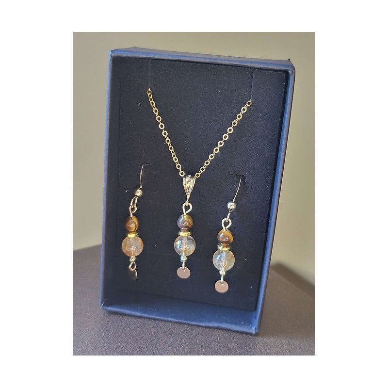 Parure composée d'un collier et de boucles d'oreilles en Oeil de tigre et Quartz rutile montées sur Gold-filled (entre l'or et le plaqué or). Zéro allergies : sans nickel, sans plomb et sans cadmium. Longueur chaîne 41 cm.