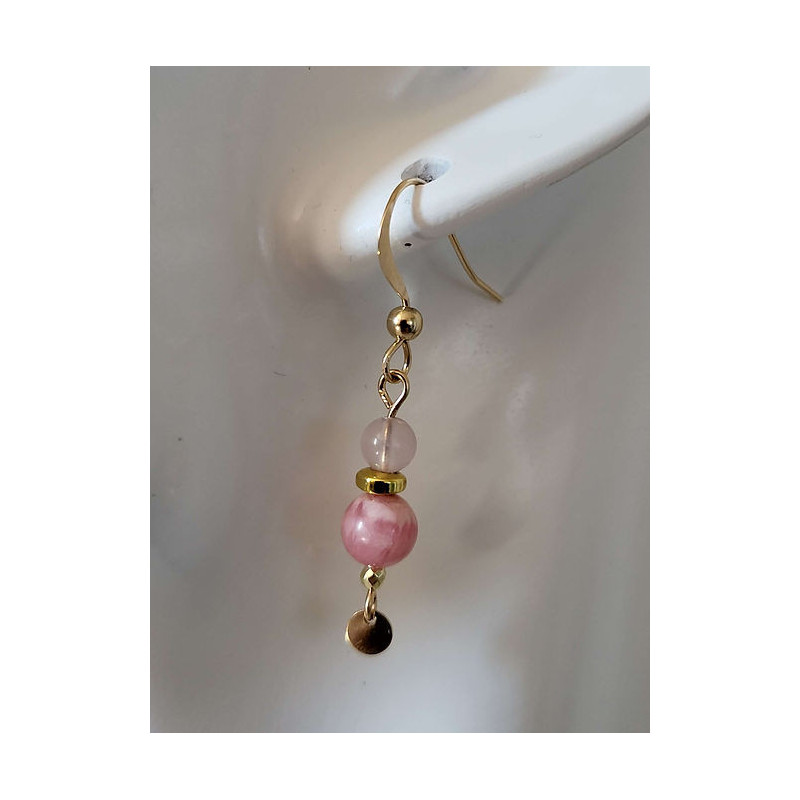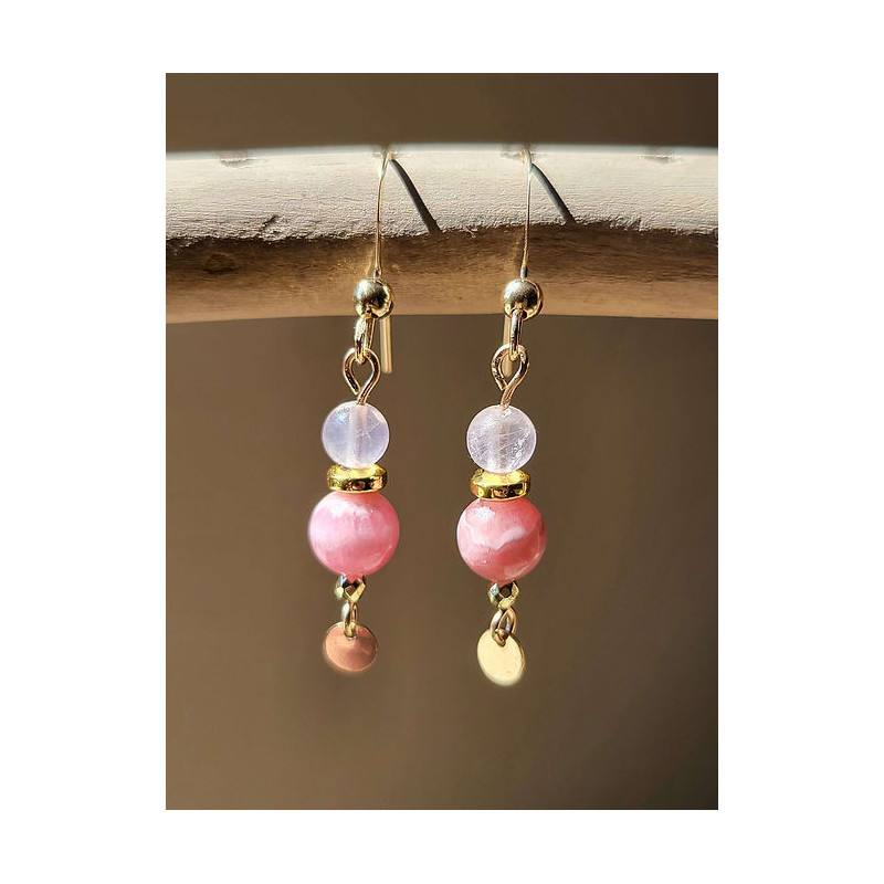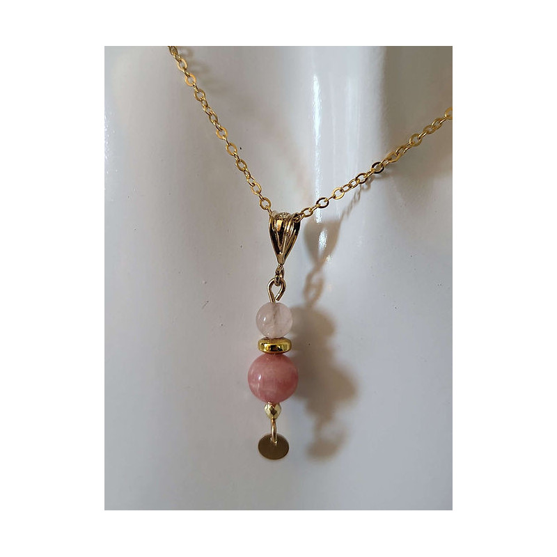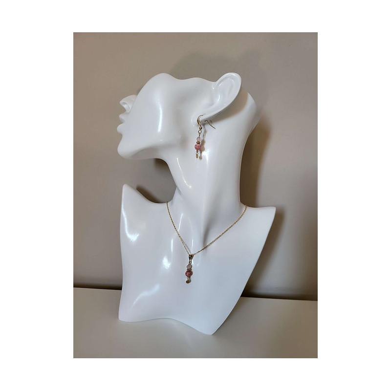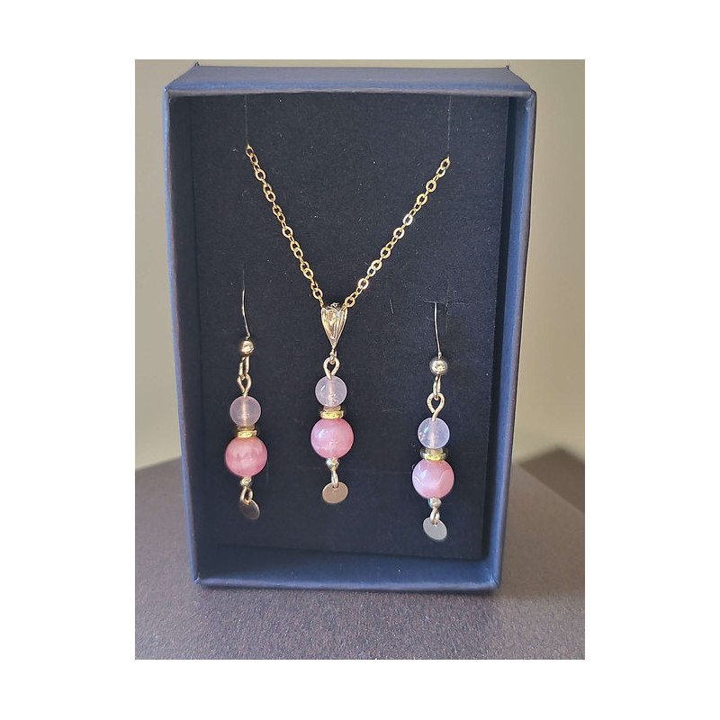Parure composée d'un collier et de boucles d'oreilles en Rhodocrosite et Quartz rose montées sur Gold-filled (entre l'or et le plaqué or). Zéro allergies : sans nickel, sans plomb et sans cadmium. Longueur chaîne 41 cm