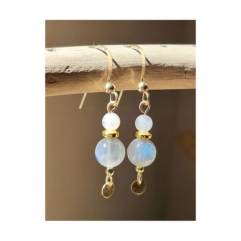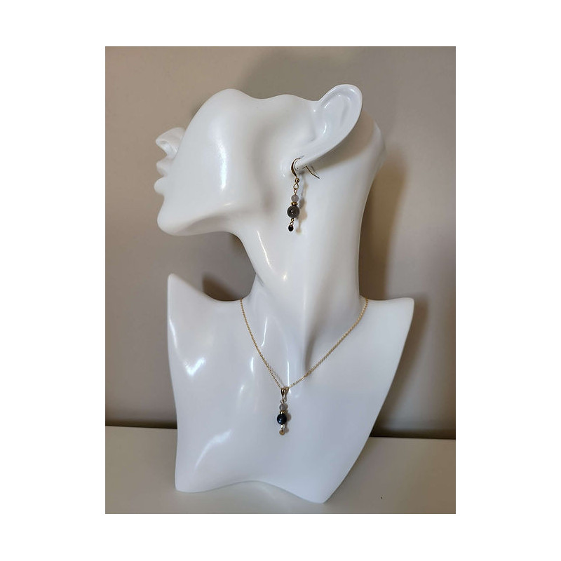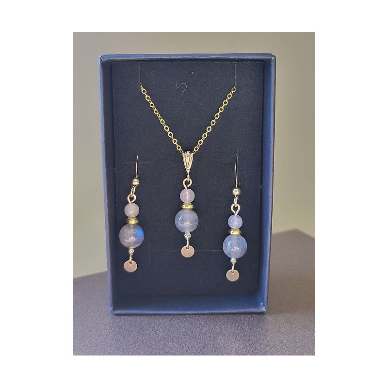 Parure composée d'un collier et de boucles d'oreilles en Sodalite et Péristérite montées sur Gold-filled (entre l'or et le plaqué or). Zéro allergie : sans plomb, sans nickel et sans cadmium. Longueur chaîne 41cm.