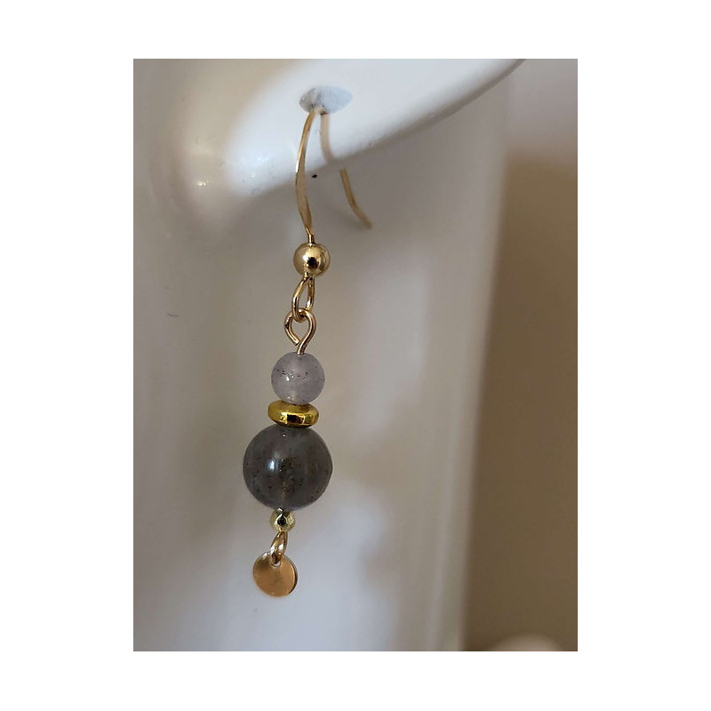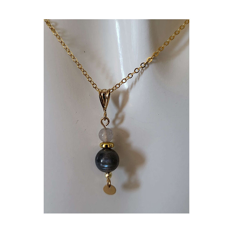 Parure composée d'un collier et de boucles d'oreilles en Labradorite montées sur Gold-filled (entre l'or et le plaqué or). Zéro allergies : sans nickel, sans plomb et sans cadmium. Longueur chaîne 41 cm.